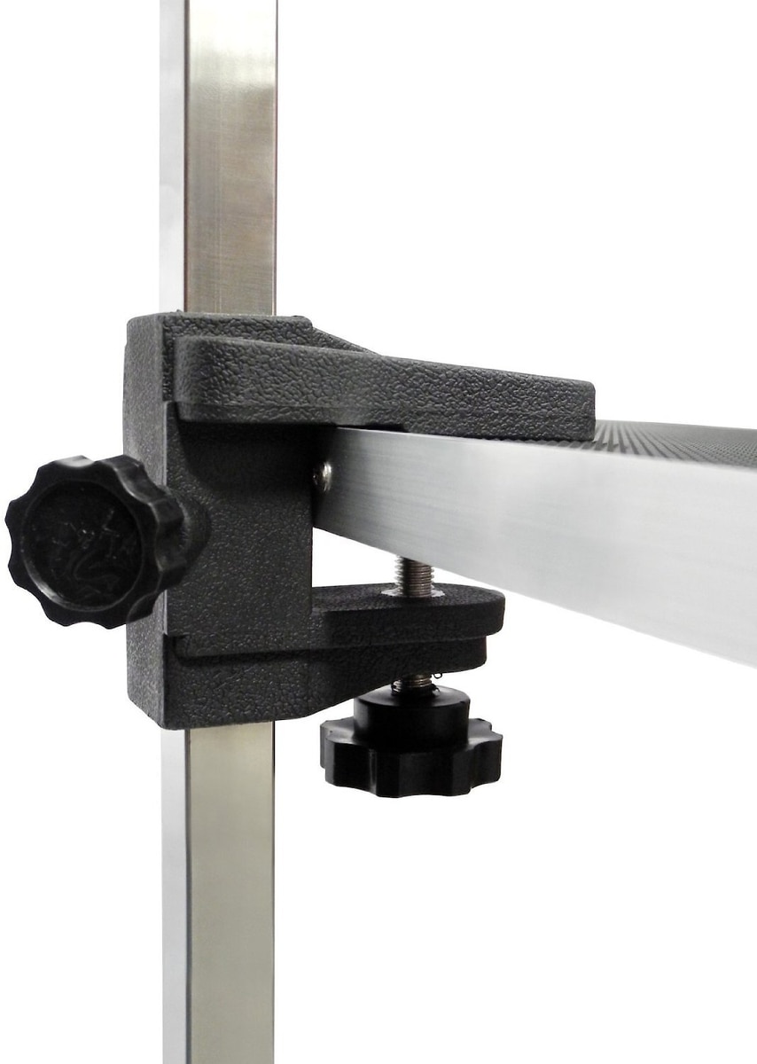 A haunch holder arm is compatible with this grooming table.
