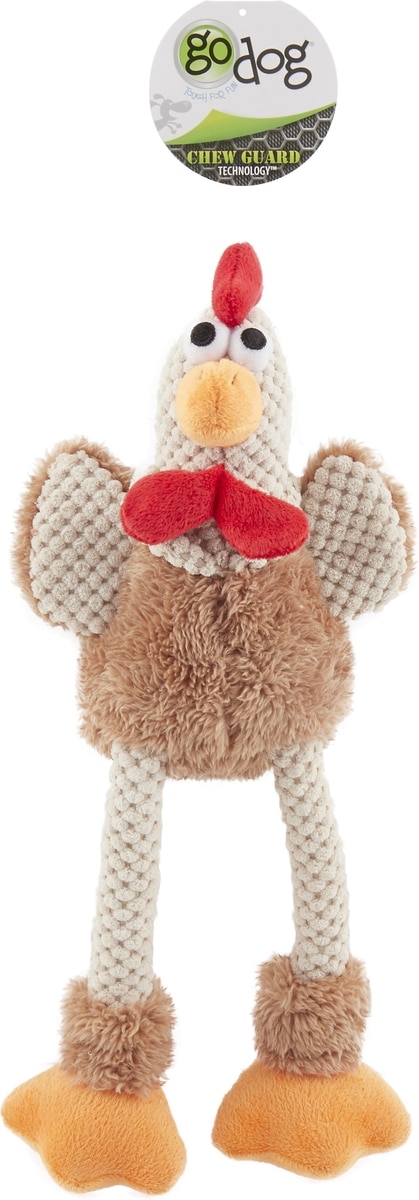 GoDog Checkers Chew Guard Rooster Squeaky Plush Dog Toy, Brown, Small