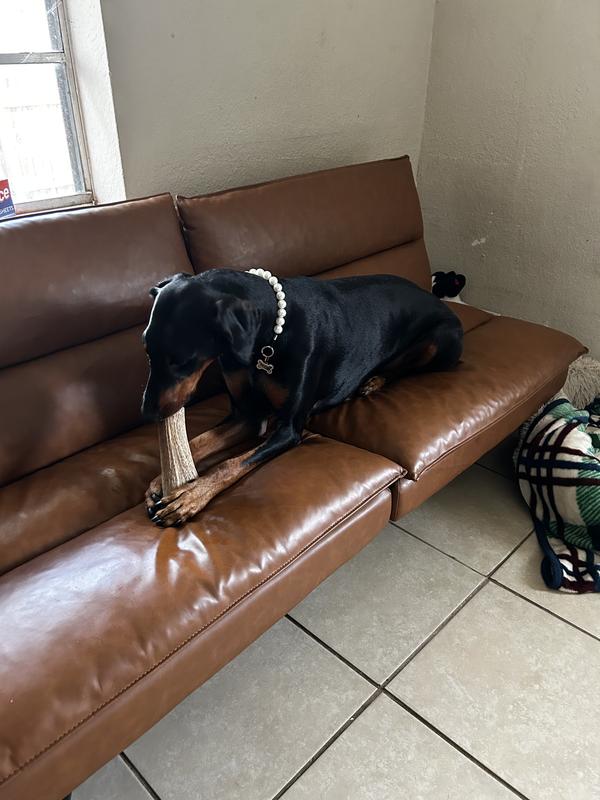 This treat will definitely last my Doberman for a few years I would bet! She’s chewed on it on and off for the last two months and has barely made a dent. It’s a huge size and she took to it right away. The antler itself was clean with no sharp edges upon arrival.