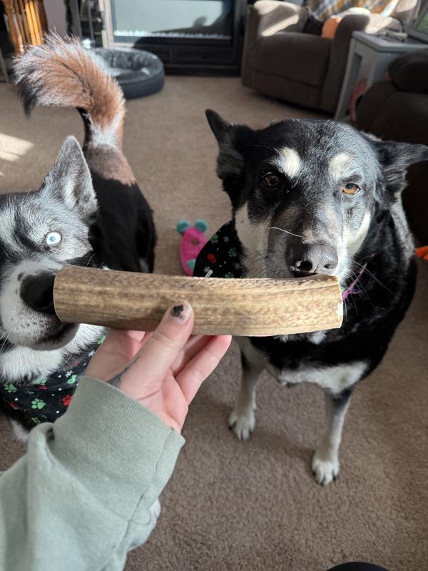Aspen loves this elk antler! We have gotten a lot of bones that say long lasting, but they usually only last a few days. This antler is definitely going to last a while! After both Aspen and Mamba have chewed on it for a while it only shows minor bite marks. This is a great way for them to clean their teeth too! I got the large size, they are huskies, and it is the perfect size for them! I just wish that you could get the large size in a 2 pack so they could both have their own.