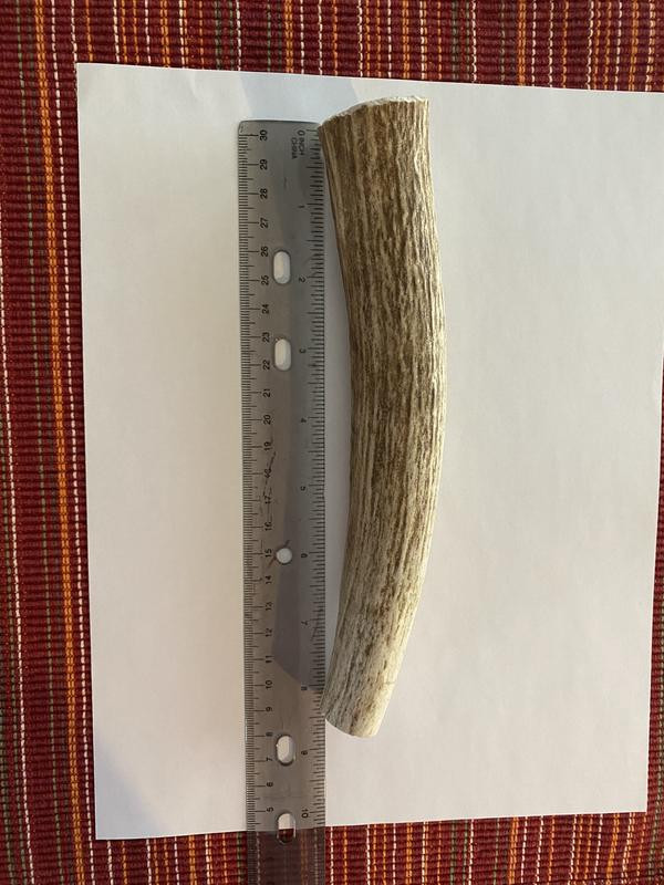 This antler is 8 " long and because it it an un-split antler it is just right for a large/X-large dog who needs to chew. It is all natural which is great to give