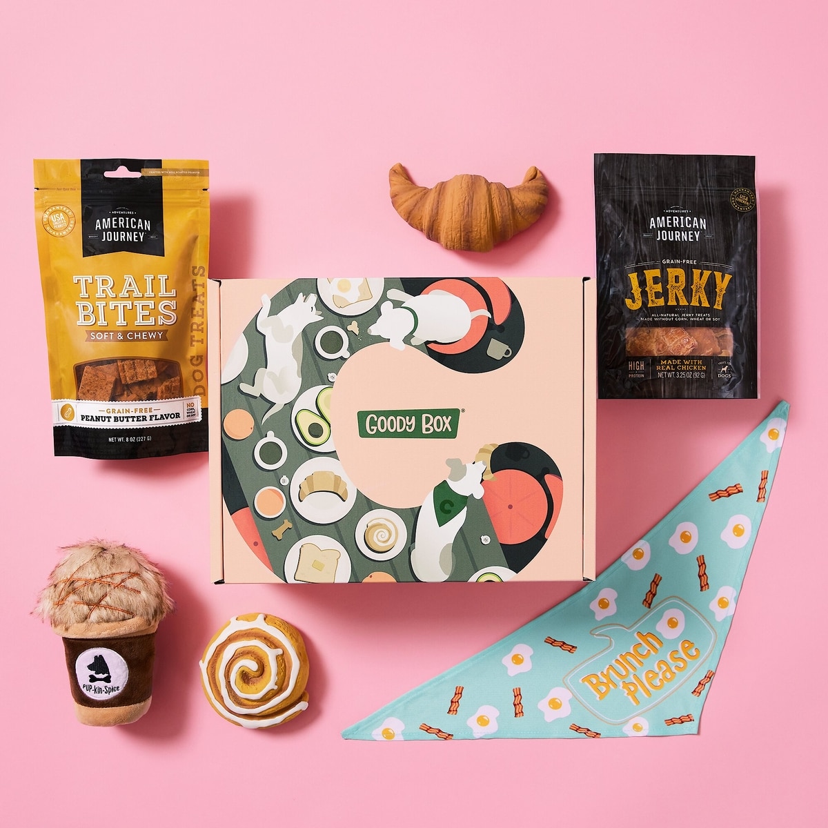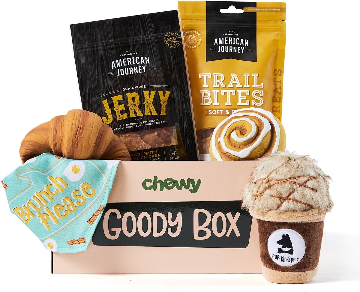 American Journey Peanut Butter Flavor Trail Bites Grain-Free Soft & Chewy Dog Treats, 8-oz bag; American Journey Chicken Jerky Grain Free Dog Treats, 3.25-oz bag; Frisco Brunch Please Dog & Cat Bandana, X-Small/Small; Frisco Cinnamon Roll and Croissant Latex Dog Toy, 2-pack; Frisco Latte Plush Squeaky Dog Toy.