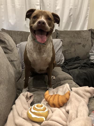 Got this box for our girls’ birthday. So much fun watching her open it up. She could not be more obsessed with the breakfast pastry toys. She carries them around everywhere. The squeakers still work after weeks of chewing/playing. Loved the treats as well!