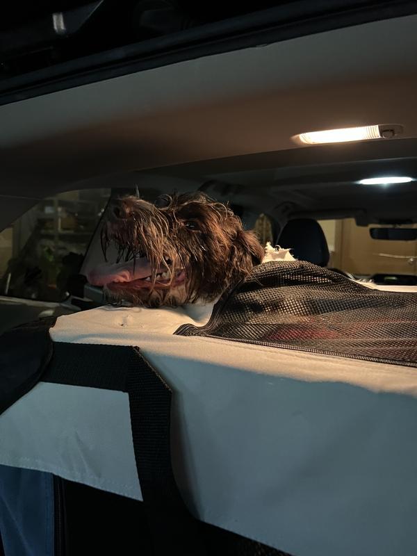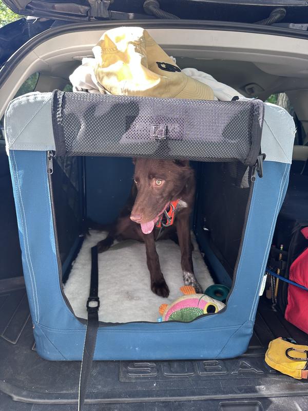 A portable and lightweight, collapsible design makes this soft dog crate ideal for travel, and it’s easy to carry with the handle or strap. Three mesh entrances provide convenience and breathability, and it comes with a removable fleece pad for comfort.