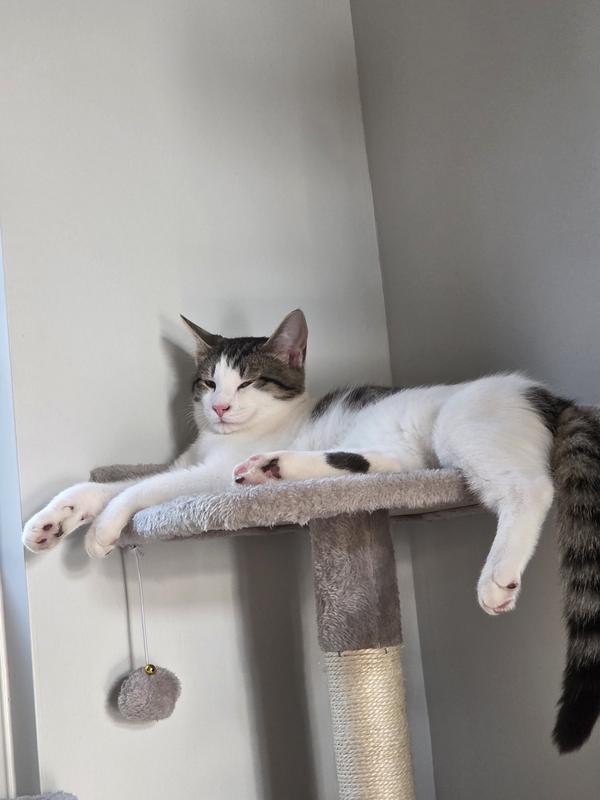All-In-One Feline Fun Zone Your cat will love the cozy, soft spaces for lounging, including two upper plush perches a private cube hideaway for rest and relaxation. The stylish design complements any home decor, and the included hanging toy provides endless entertainment.