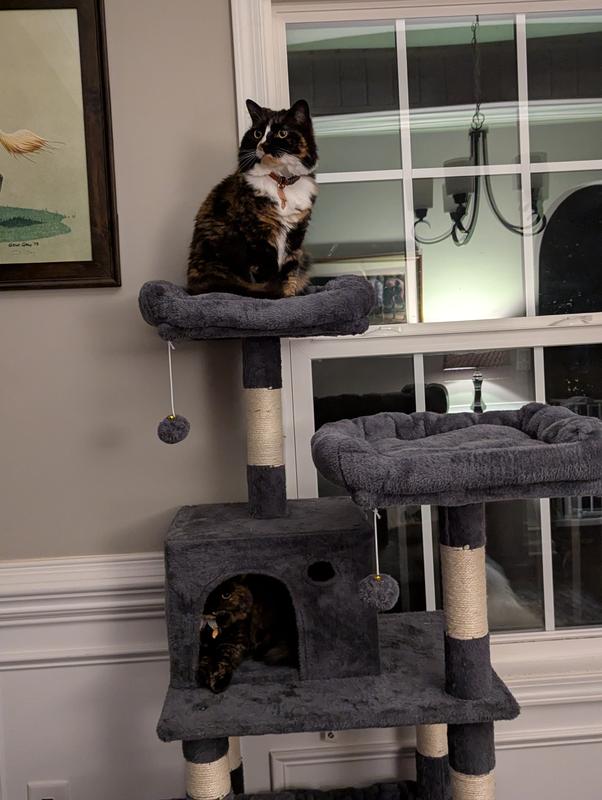 Wrapped sisal posts withstand daily shredding and help redirect furniture-destroying behaviors. Your kitty will love curling up in the deep, fluffy hammock, and the large condo provides them with cozy personal space and welcome privacy.