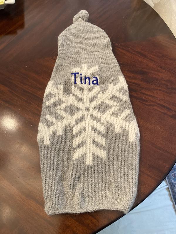 Fabulous sweater, but the monogramming is so high up on the sweater that the hood entirely covers it unless the hood is on my dogs head. Future orders should think about that when placing the names. Very very nice 100% wool sweater. Well worth the money!