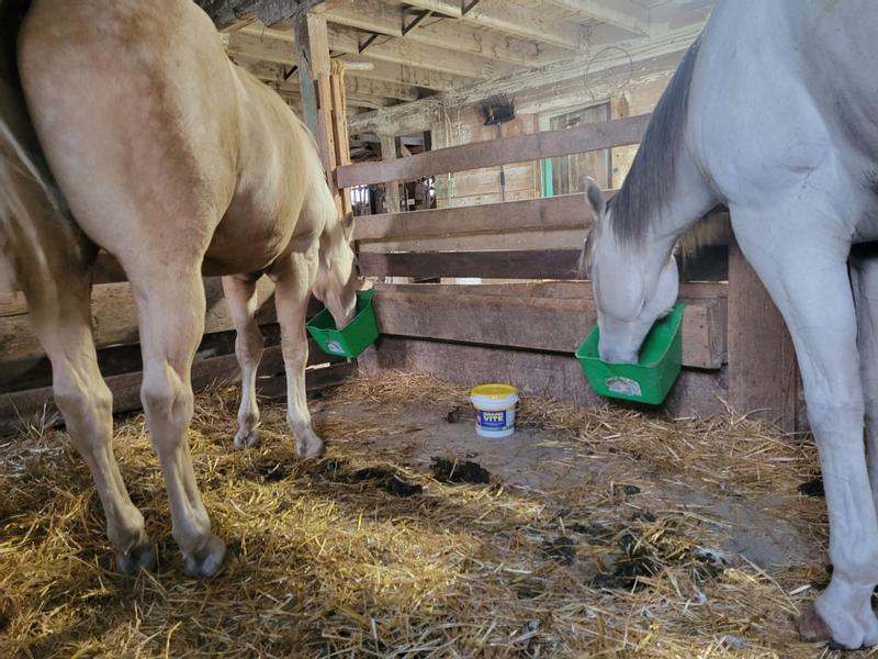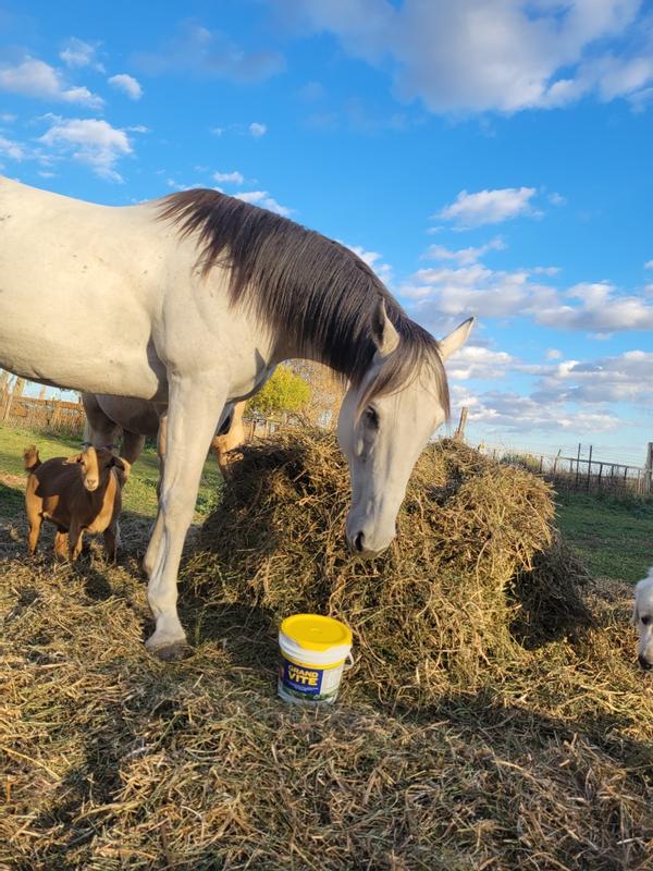 The horses are happy to eat this supplement. I haven’t seen much of a difference yet but I think that is because they haven’t been on it long enough. I like the convenience of the pail and it mixing well into their feed.