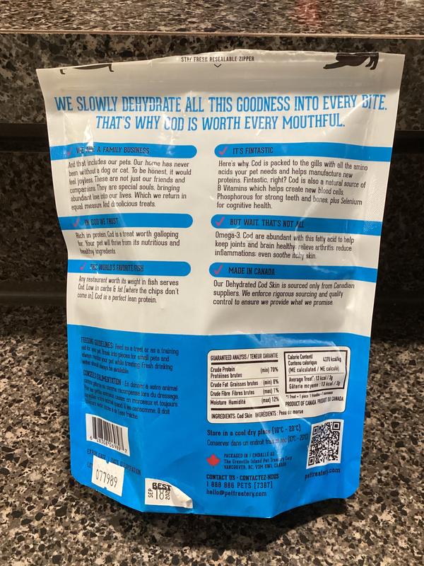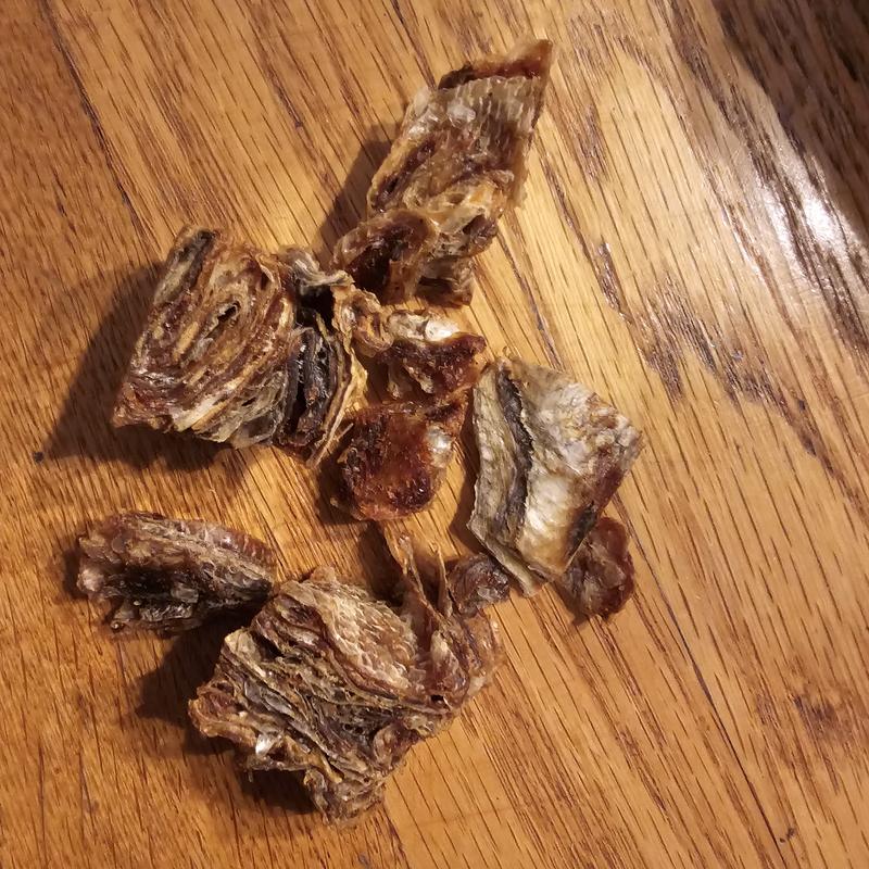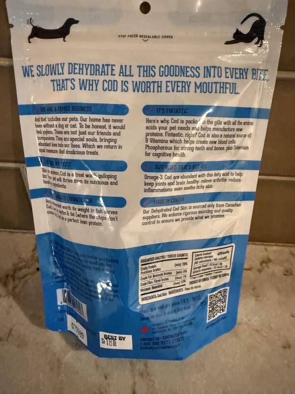 Fish and No Chips Premium Dehydrated Cod Skin pet treats for dogs and cats. COD is a good source of amino acids and Vitamin B. It helps keep the joints and brain healthy. It also helps reduce inflammation and itchy skin. My kitties loved it!