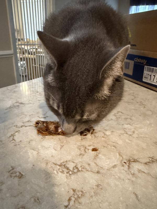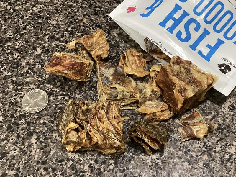 My dog loves these treats, my cat didn’t want anything to do with them. They are a little messy, so we give them in the garage. Not sure if those are fish scales flaking off, but I didn’t want that in my house. They are a crispier treat. There are some larger chunks in the bag which need to be broken up. But also some smaller pieces are in the bag.