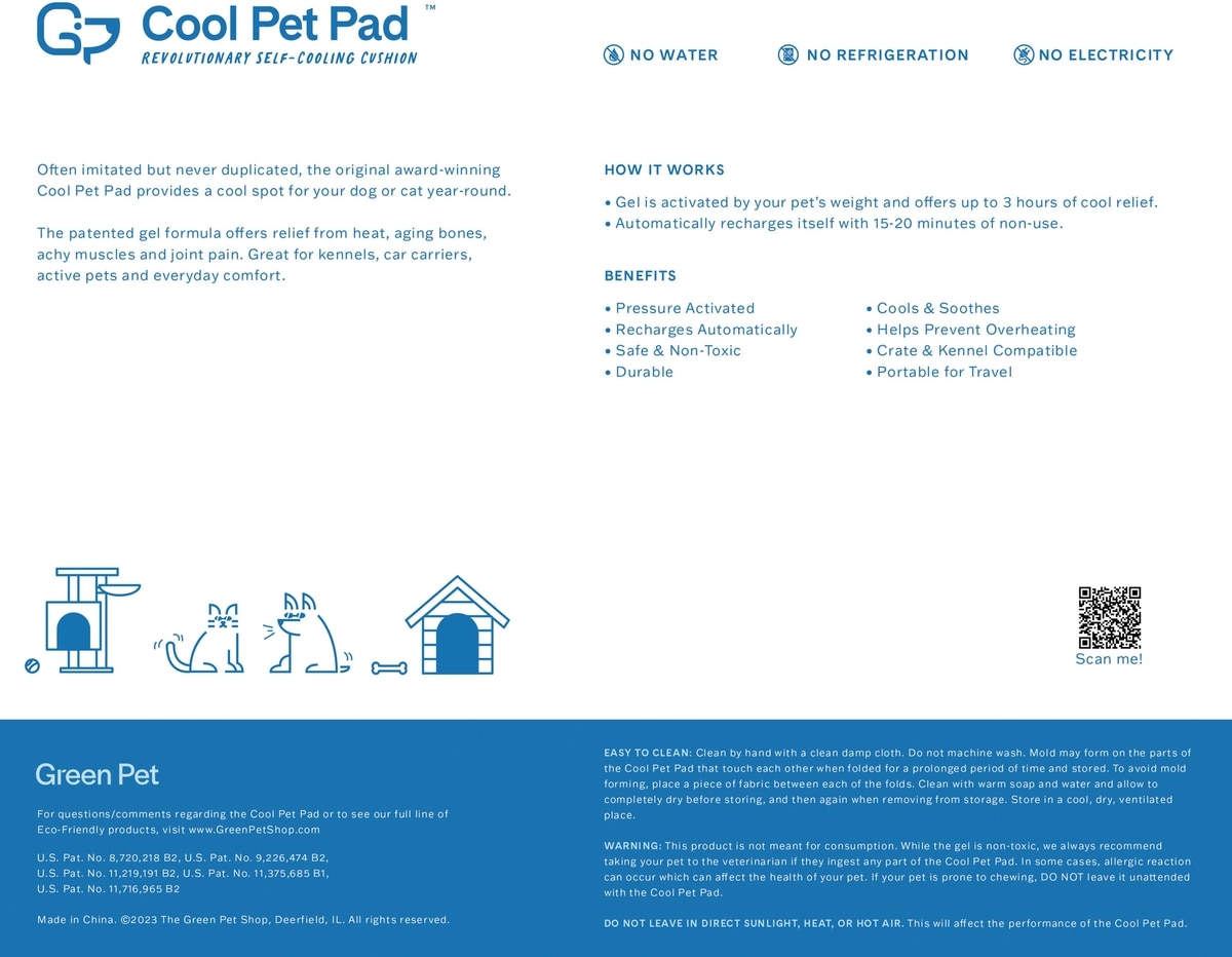 Keep your pets cool with the Green Pet Cool Pet Pad. This eco-friendly mat activates with pressure, no water or electricity needed. Perfect for indoor use, it cools for up to 3 hours and recharges in just 15-20 minutes.