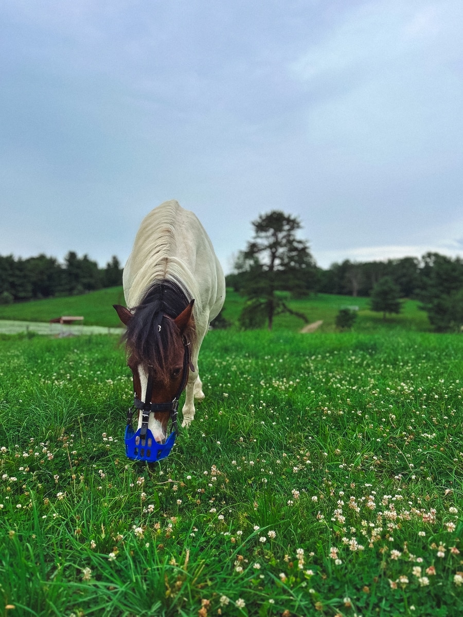 According to the National Equine Welfare Council's Grazing Muzzle Guidance, grazing muzzles can reduce grass intake by up to 80%. In practice, real grass restriction depends on a number of factors, the grazing muzzle, the horse that is wearing it, how tall the grass is and how practiced the horse is at grazing in a muzzle, among others. What is undeniable is that horses in grazing muzzles get more exercise than horses in stalls or in dry lots. A turned-out, muzzled horse gets less grass and more exercise, both of which contribute to weight management.