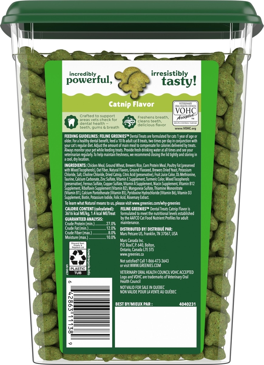 Greenies come in 4 different sizes, from small pouches to big tubs. Formulated for cats 1 year of age or older, these tasty natural dental treats are nutritionally complete and balanced for adult cats.
