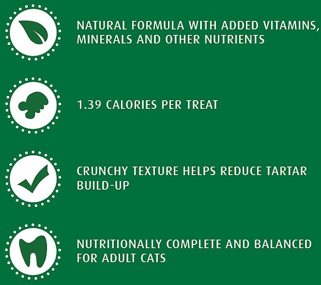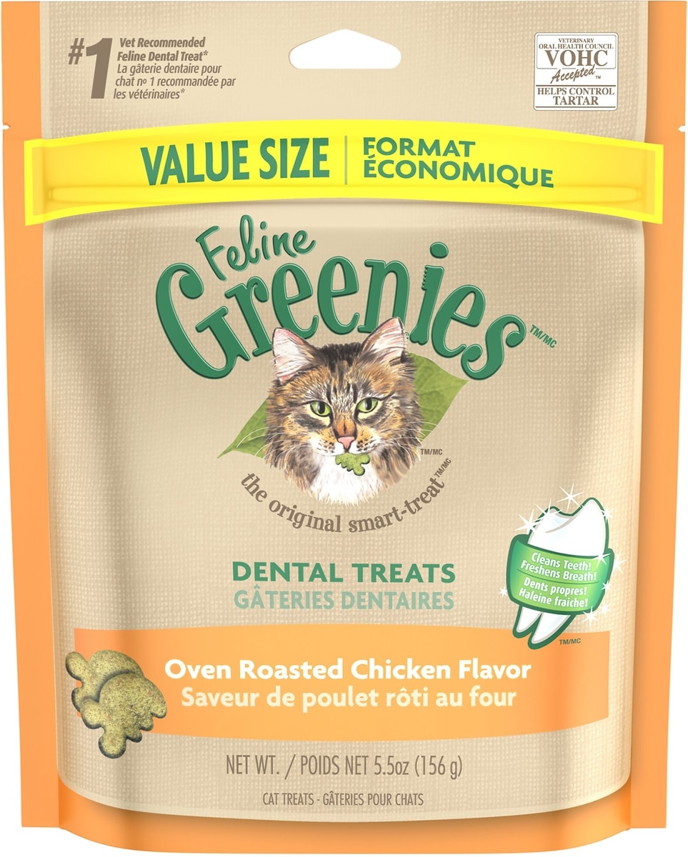 Greenies come in 4 different sizes, from small pouches to big tubs. Formulated for cats 1 year of age or older, these tasty natural dental treats are nutritionally complete and balanced for adult cats.