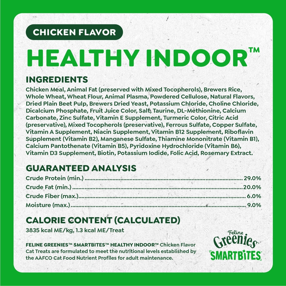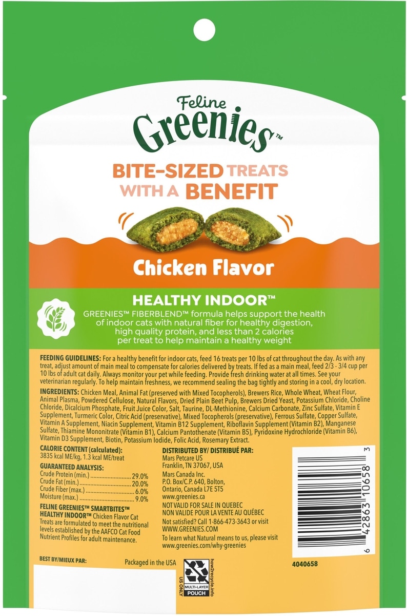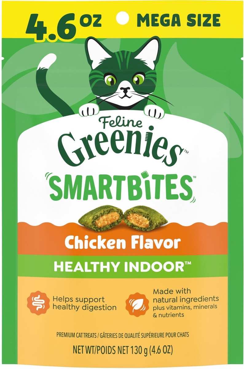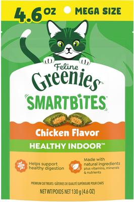 - Greenies Feline SmartBites Healthy Skin & Fur Natural Chicken Flavor Soft & Crunchy Adult Cat Treats, 4.6-oz bag$5.48 Chewy Price$6.49 List Price$5.21 Autoship PricePromo, New Customers Only: Spend $49+, Get $20 eGift Card