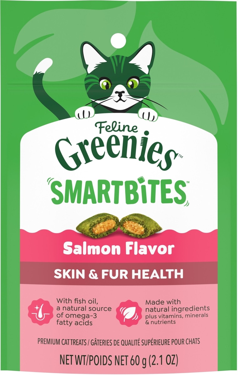 Greenies Feline SmartBites Healthy Skin & Fur Natural Salmon Flavor Soft & Crunchy Adult Cat Treats, 2.1-oz bag