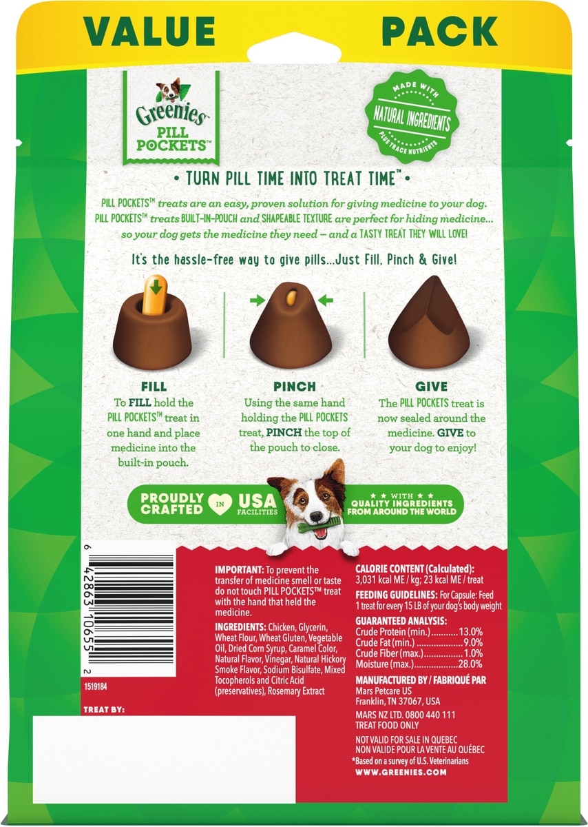 - Greenies Pill Pockets Canine Chicken Flavor Natural Dog Treats, Capsule Size, 60 count$15.99 Chewy Price$19.99 List Price$15.19 Autoship PricePromo, New Customers Only: Spend $49+, Get $20 eGift Card