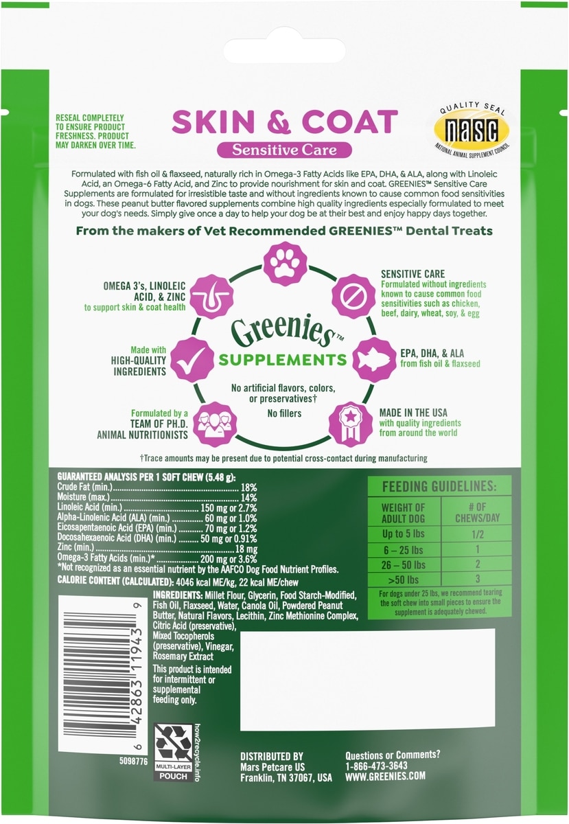 Greenies Skin & Coat Sensitive Care Peanut Butter Flavor Supplement for Dogs, 40 count