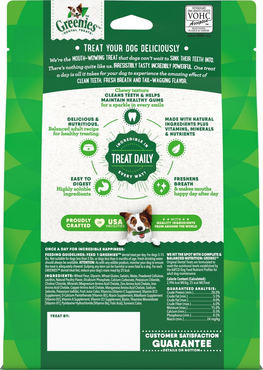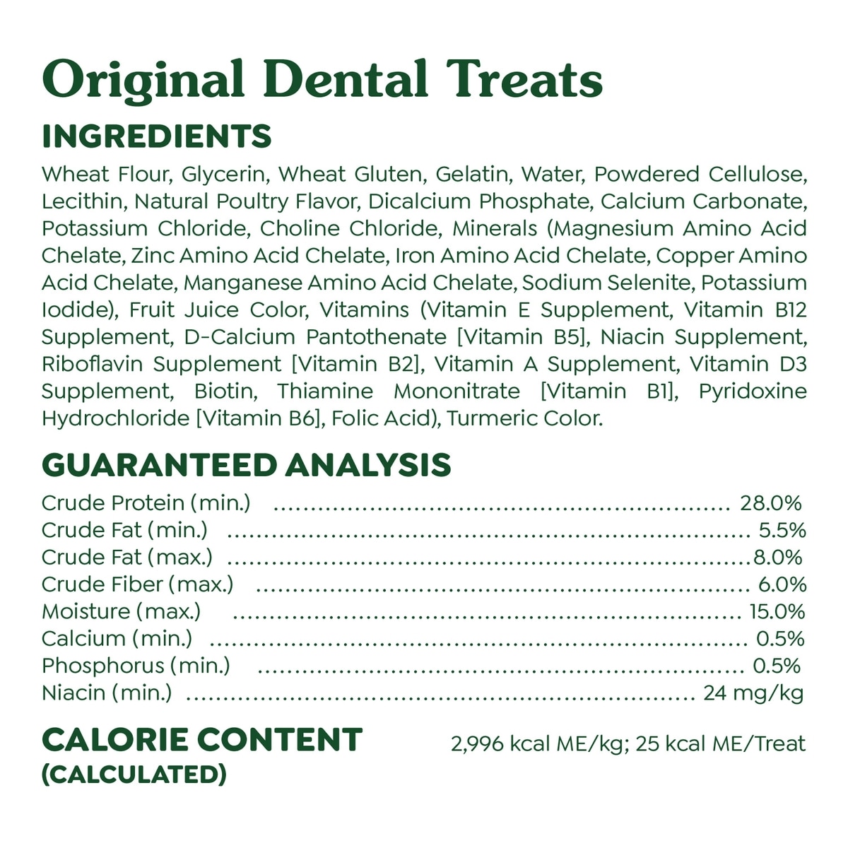 One Greenies Original Dental Treat a day is all it takes for cleaner teeth, fresher breath, and a happy dog. Made with natural ingredients plus vitamins, minerals, and nutrients, these mouth-wowing treats help promote oral hygiene with every bite.