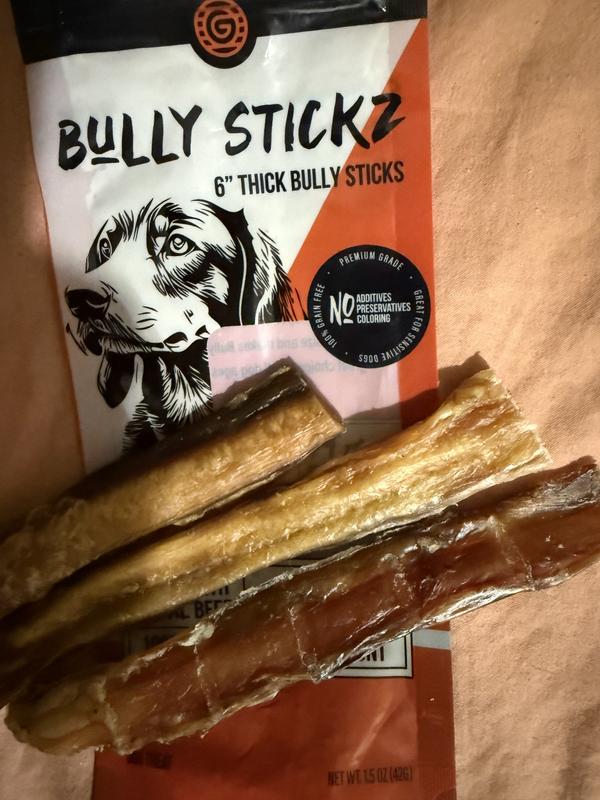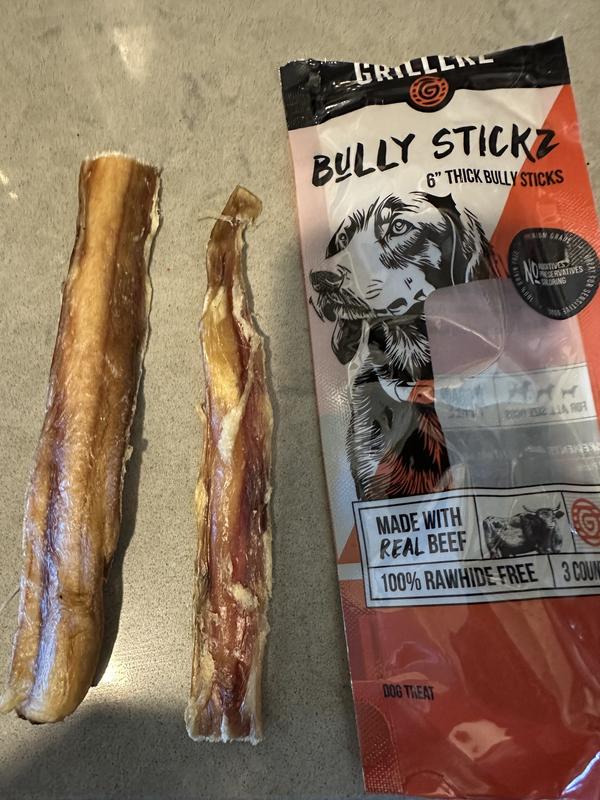 I got the 6-inch bully chew stick for my dog, and he absolutely loved it! From the moment I gave it to him, he was completely focused, chewing nonstop until finished. My dog is a big chewer, so it didn't last very long. Unfortunately, one of the sticks was half the thickness as the other and my dog finished it in a minute. On a positive, there was no unpleasant smell like some other bully sticks I’ve tried. I also liked that it didn’t leave any messy residue on the floor. Overall, it was a nice treat, but didn't last as long as I'd hoped. Still worth it for a special treat.