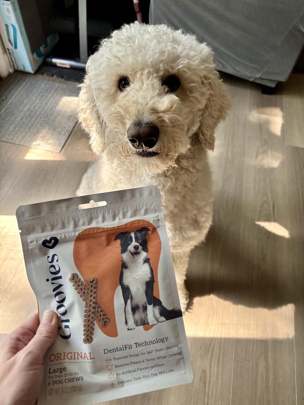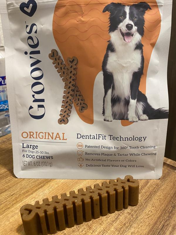 Made with proprietary DentalFit technology, Groovies Dental Treats for dogs are designed to fit your pup’s teeth, effectively targeting and removing plaque and tartar.