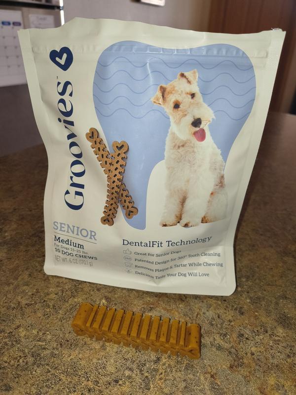 Made with proprietary DentalFit technology, Groovies Dental Treats for dogs are designed to fit your pup’s teeth, effectively targeting and removing plaque and tartar.
