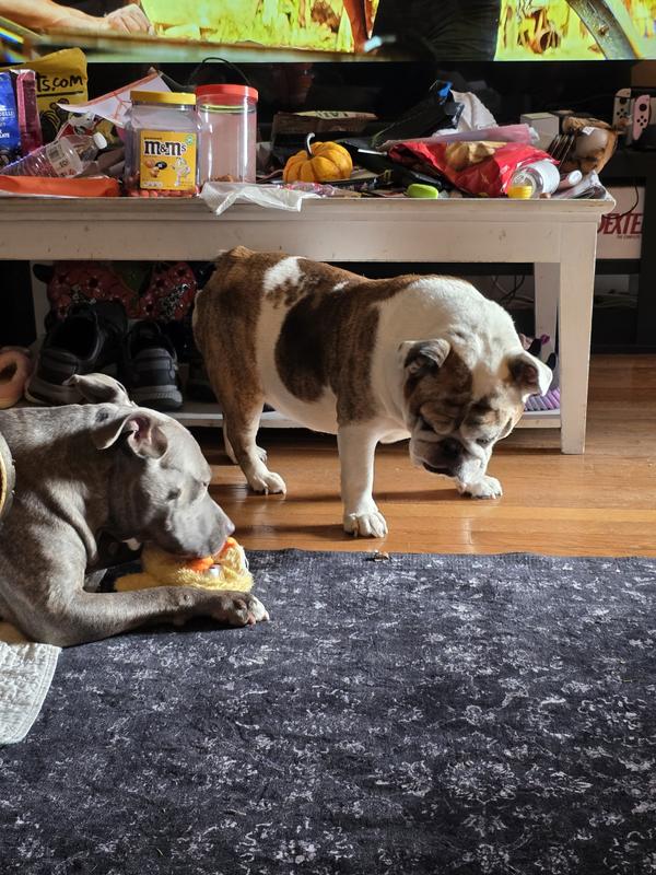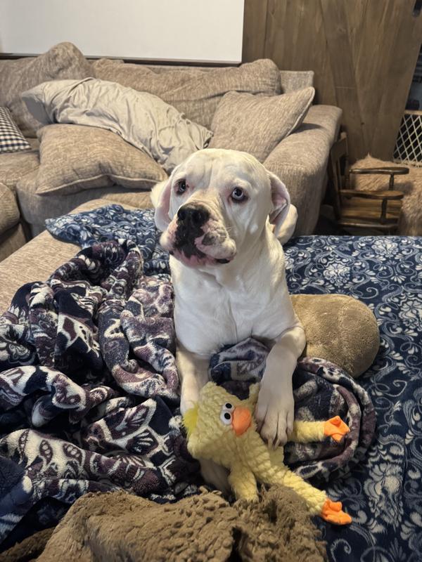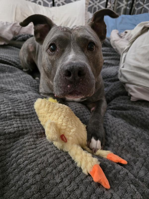 The GROWL Block Heads Chick Squeaky Plush Dog Toy is pretty much just another dog toy. My 130 lb American Bulldog seems to really enjoy it, especially the squeaker — that’s definitely the highlight. He’s very gentle with his toys, so it’s holding up fine for him so far. That said, I’m still unsure about its durability. My pitbull, who loves to chew toys to pieces, hasn’t gotten ahold of it yet, and I honestly don’t know how well it would survive once he does. For light chewers or dogs who enjoy squeaky plush toys, it’s a fun option, but for aggressive chewers, I’m skeptical it would last long.