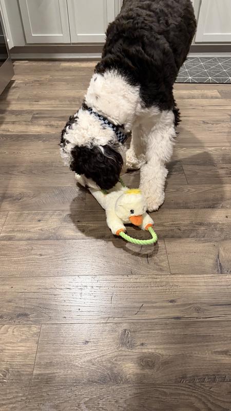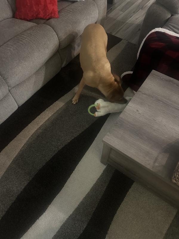 Gunner absolutely loved this toy… so much so I had to chase him down to even try and play tug of was with him. 😄 It squeaks, has ropes, has the stuffed animal part… so it’s a win win!