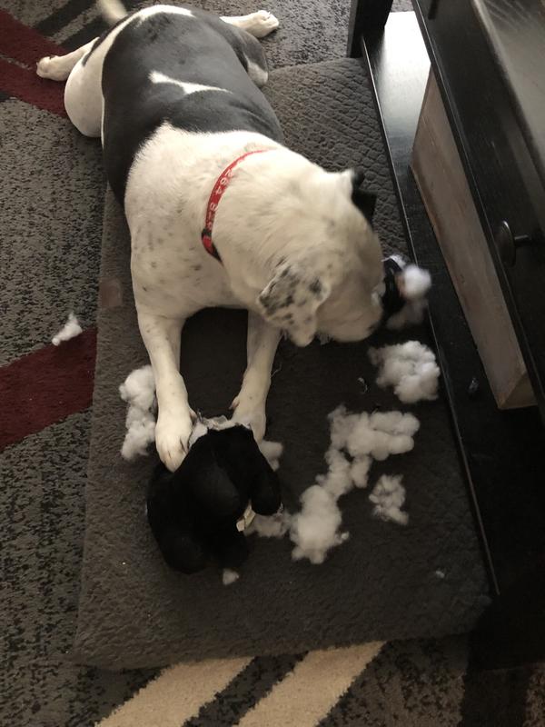This is the perfect toy for my grand dog! He's a pit bull- size is important. This toy is not too small, not too big. It's soft and cuddly. The bear does not have