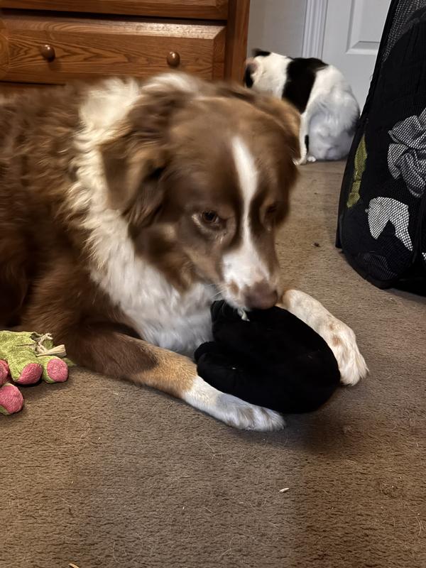 This is such a great toy! Our Aussie loves it, easy to say it’s his new favorite toy. The material is very tough and the squeezer is not too crazy. Just enough to make it fun! There is a good amount of stuffing and the toy itself is a good size!