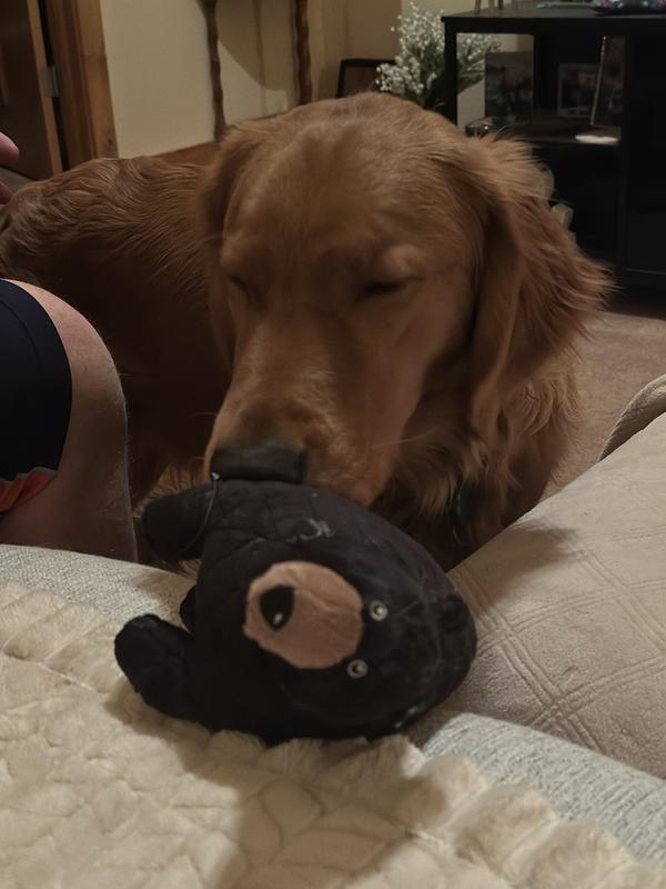 This Grrreen Black Bear is a hit in my house. Big, soft, and squeaks like it is trying to communicate with satellites. My large dogs grabbed it right away and play