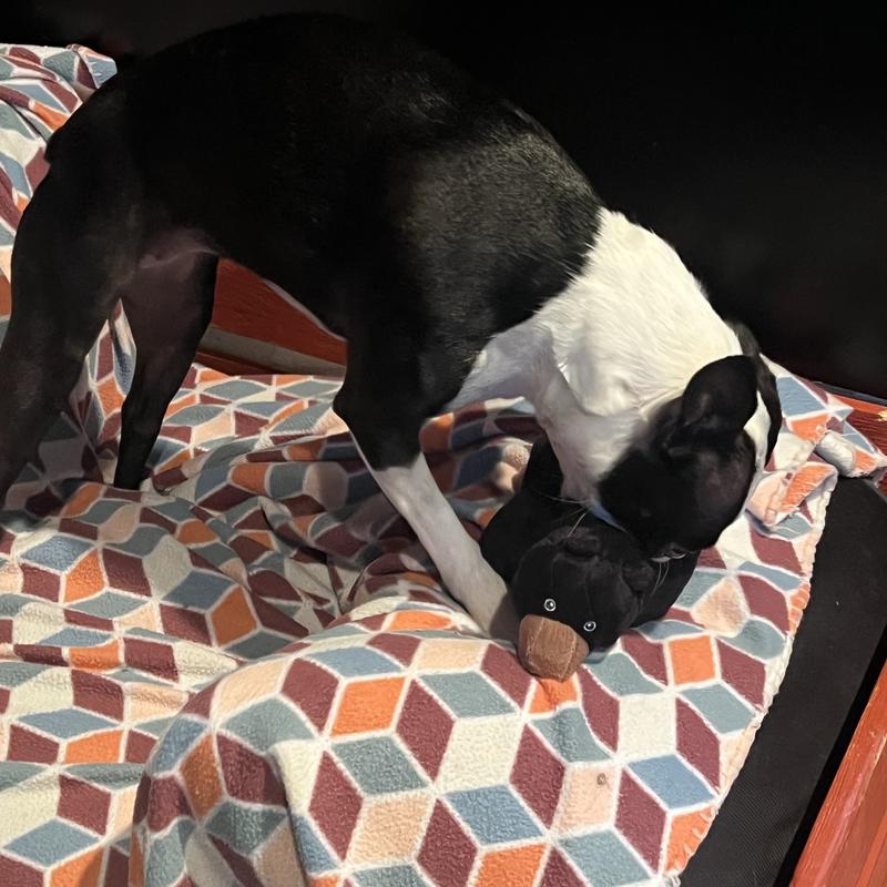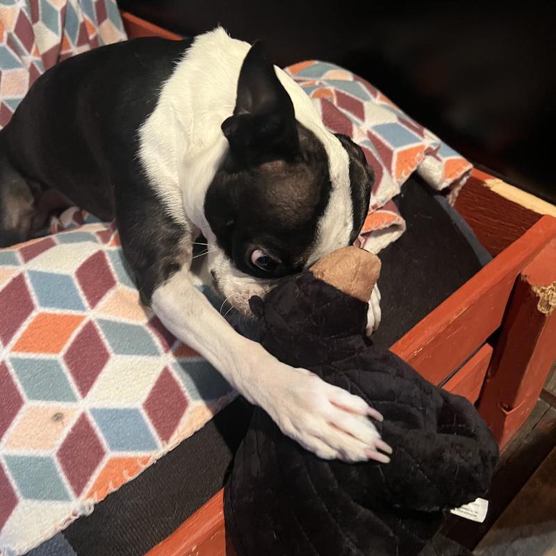 This is the perfect toy for my grand dog! He's a pit bull- size is important. This toy is not too small, not too big. It's soft and cuddly. The bear does not have a squeaker and is sturdy- it cannot be chewed apart easily. The bear is made from recycled plastic bottles, but you would never know it. I like that he's washable too. If you choose to get this for your fur baby, you won't be sorry!