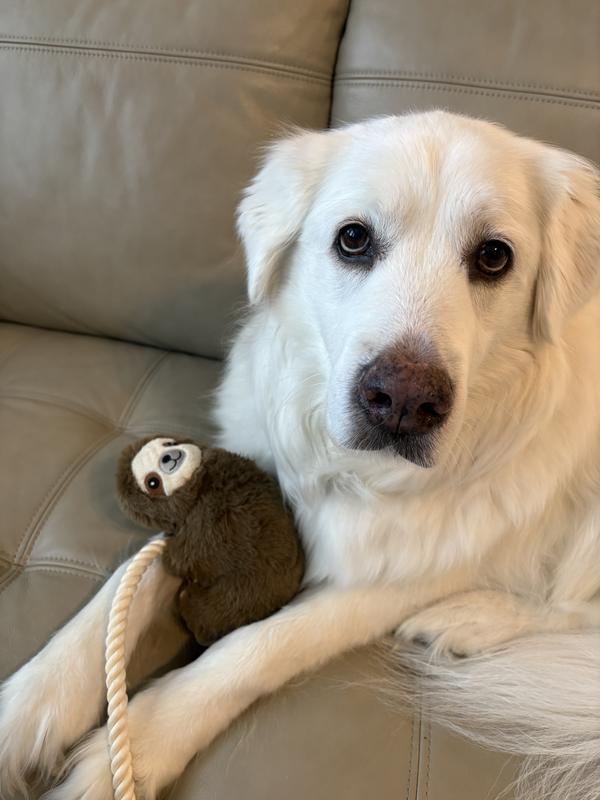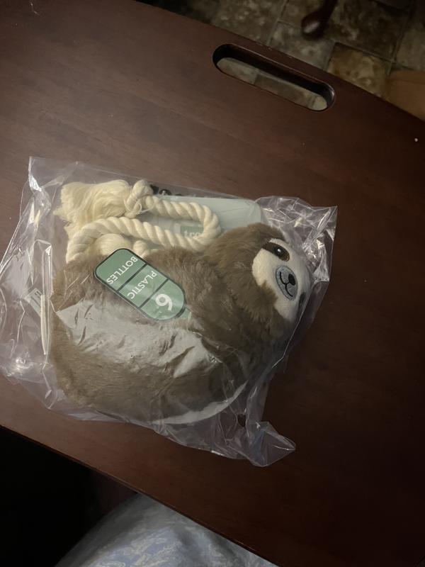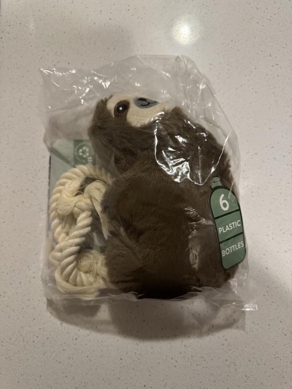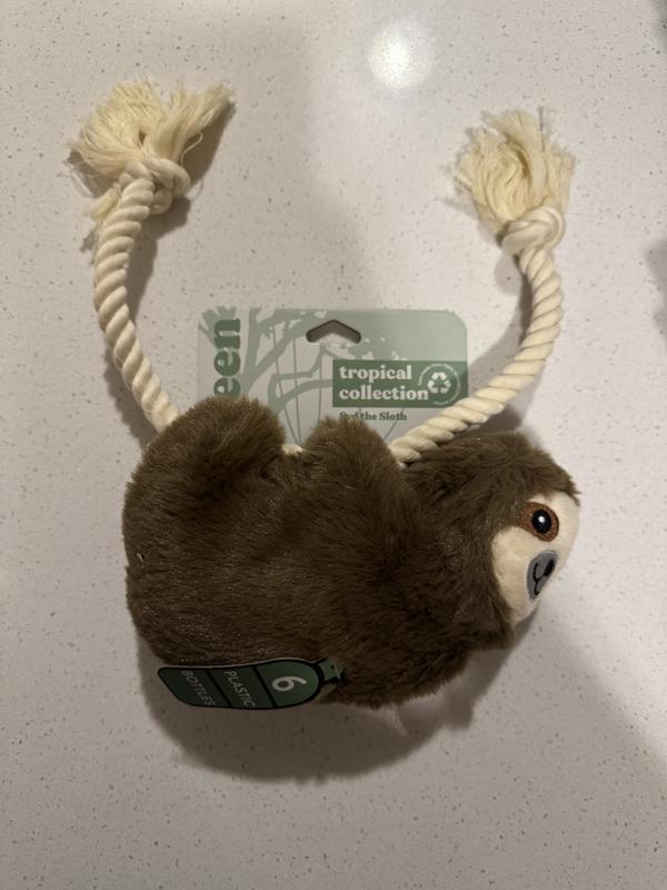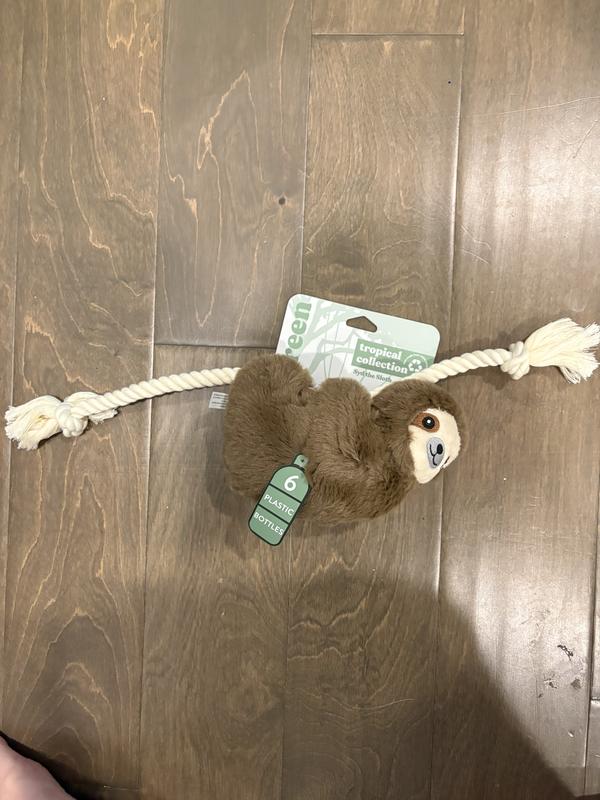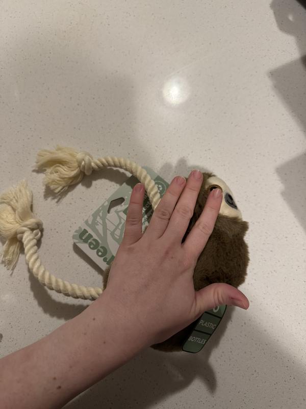 The Grrreen Sloth with Rope Squeaky Plush Dog Toy, Large is very cute. It has everything my dog loves in her toys. Soft to lay on during naps, rope to flip it