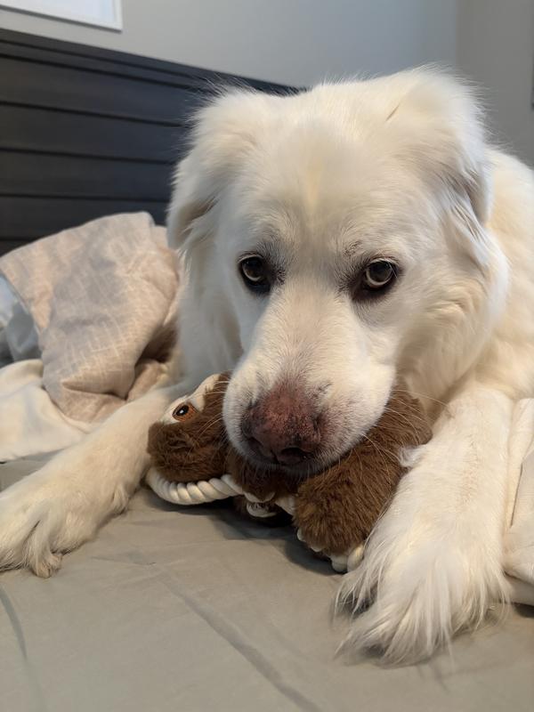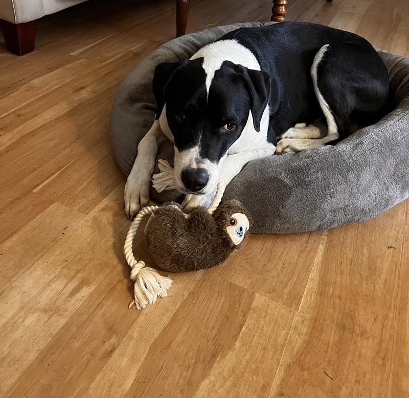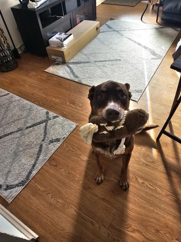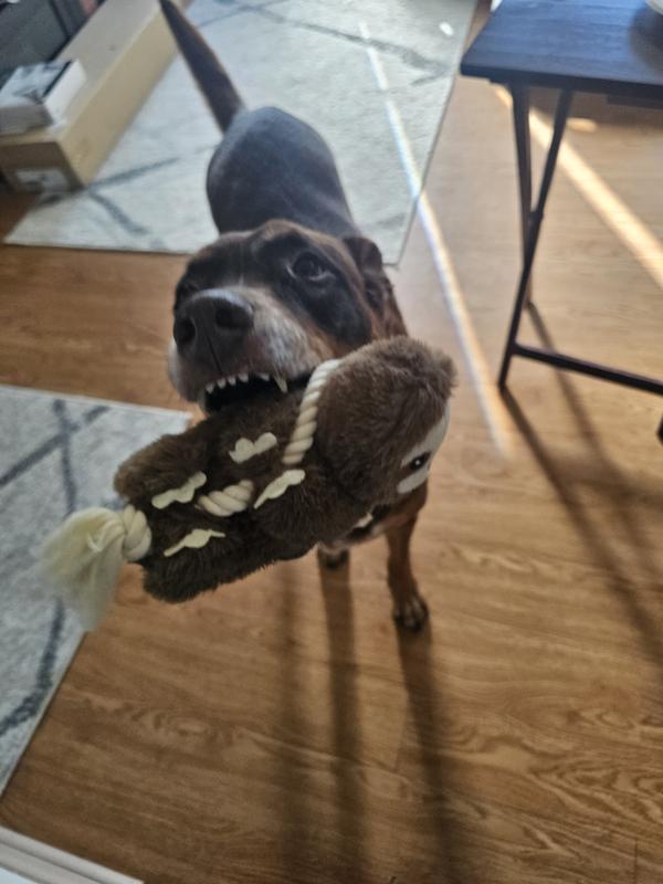My girl loves this sloth squeaky rope toy! It’s durable, but maybe not for the serious chewer. I do wish there was more than just one squeakers in it. The rope slides which is a nice touch.