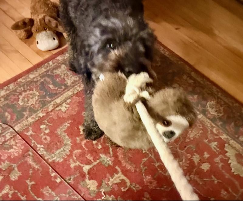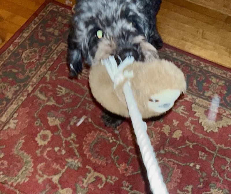 Lulu loves this toy as is evidenced by the fact that after two weeks she has not torn it to pieces. The toy has a squeaker and she usually feels the need to remove those ASAP. She brings it to me to play tug and often takes it to bed with her at night. I like this toy because, well, it is so cute. Who doesn’t like a sloth? The rope got pulled out of the sloth’s arms once but the construction of the toy makes it easy to fix. The rope is also of good quality.