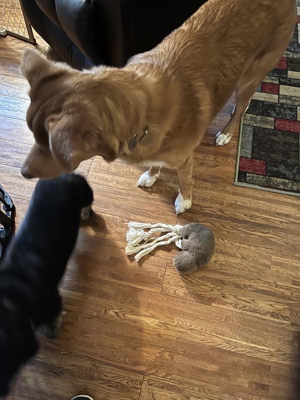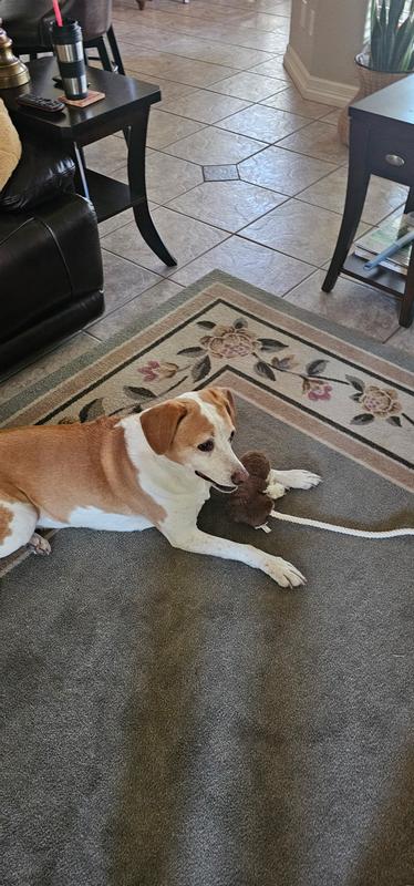 Dog could not get this toy fast enough. He loves to put in my lap and grab the rope to play. We have played so hard we broke one of the feet that holds on the rope but then I will have 2 toys. good product.