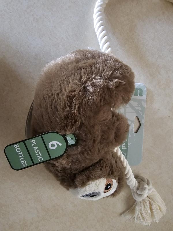 Cute little sloth toy. It s nice to know that it’s made from recycled materials. My dogs like to chew on the braided ropes. Washes well in the wash machine.