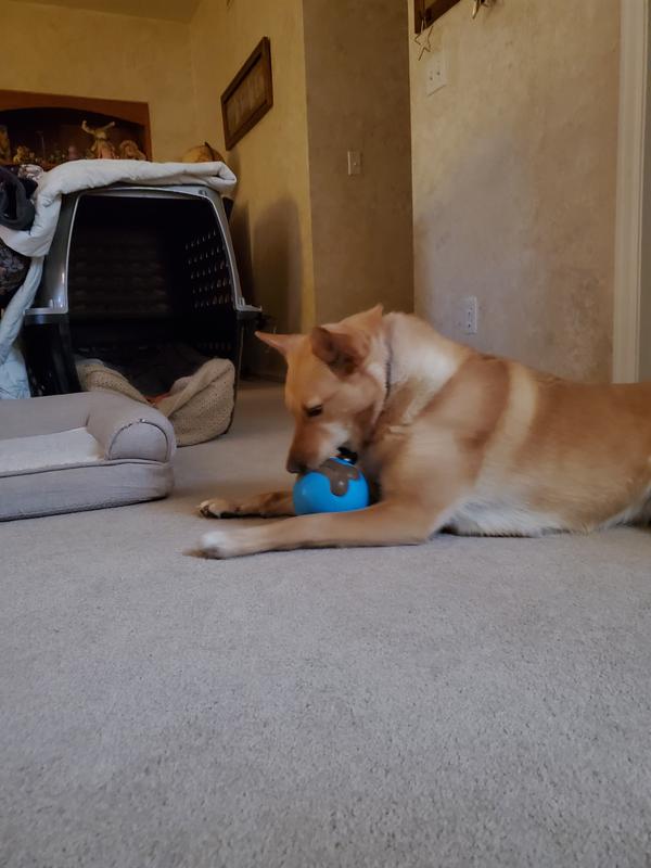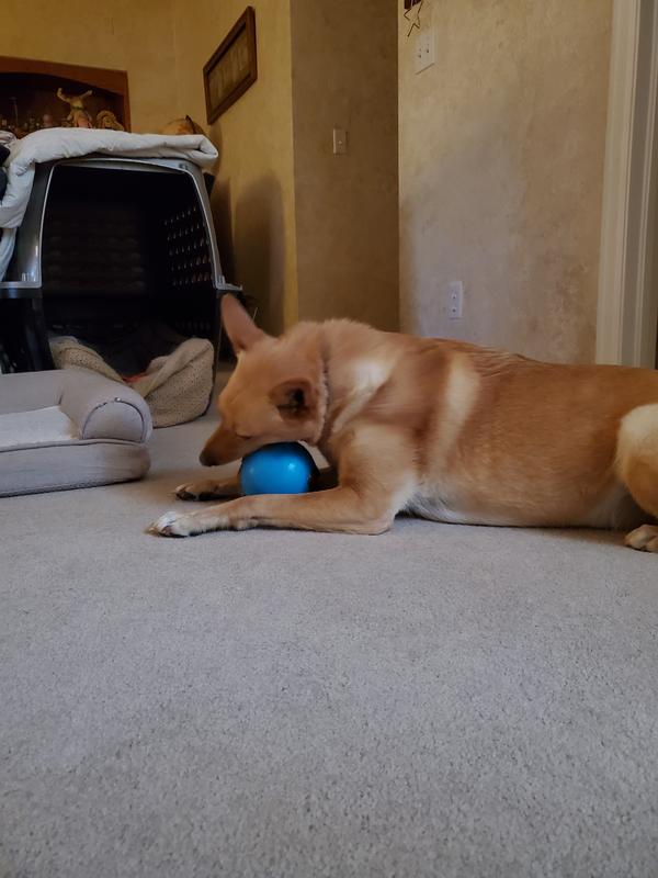 I wasn't sure if my girl, a Rough collie/terrier mix, would enjoy something like this as she tends to regard every treat with suspicion, but she's really enjoying it. I tried it out on her before leaving her alone with it. She's not alone much but she does like to bark out the window when I go out and that's probably from boredom. I asked my neighbor how she's doing on the barking since this Busy Ball arrived and she's actually quiet and the ball is empty when I get back, so it's doing exactly what it needs to do and is entertaining her. It doesn't have a rubber or plastic odor, which is great. It gets an A+ from me and my girl Sadie!