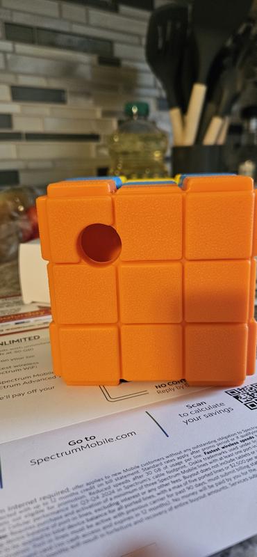 - The toy features spinning layers and treat dispensing holes for added engagement.