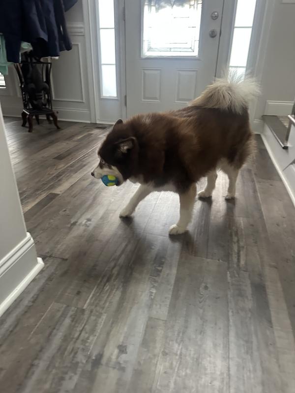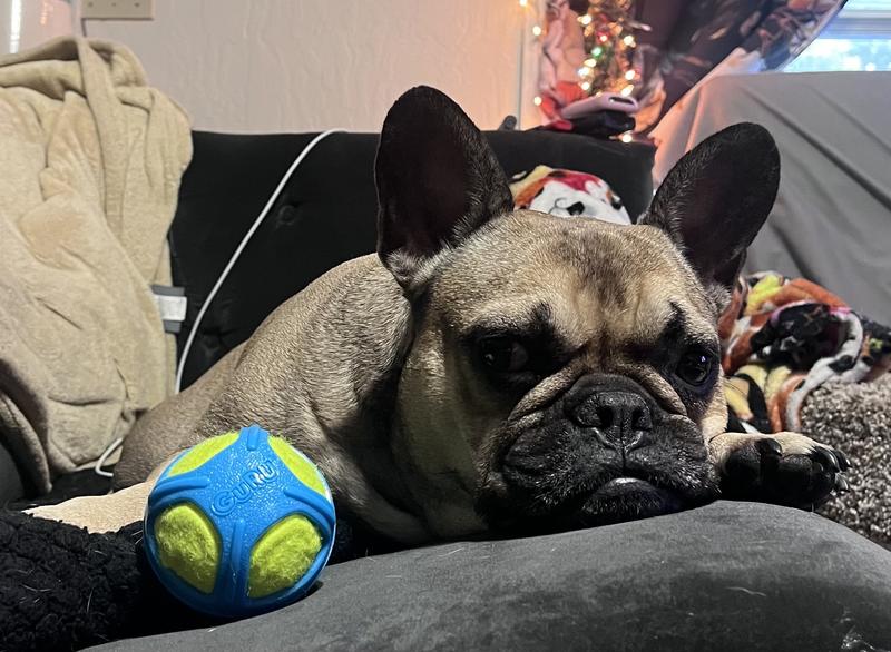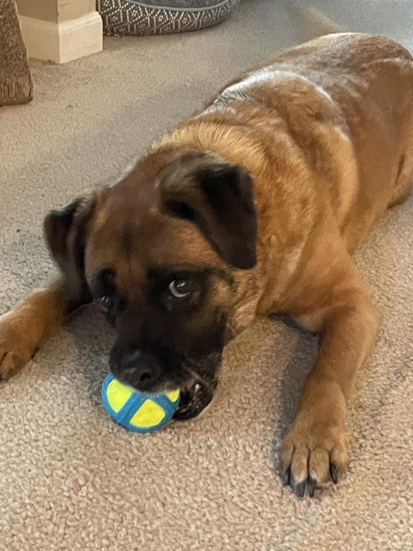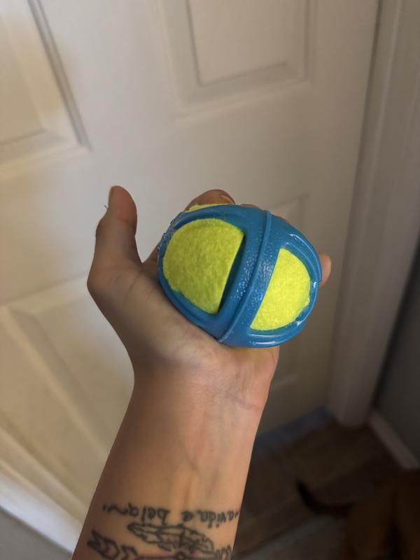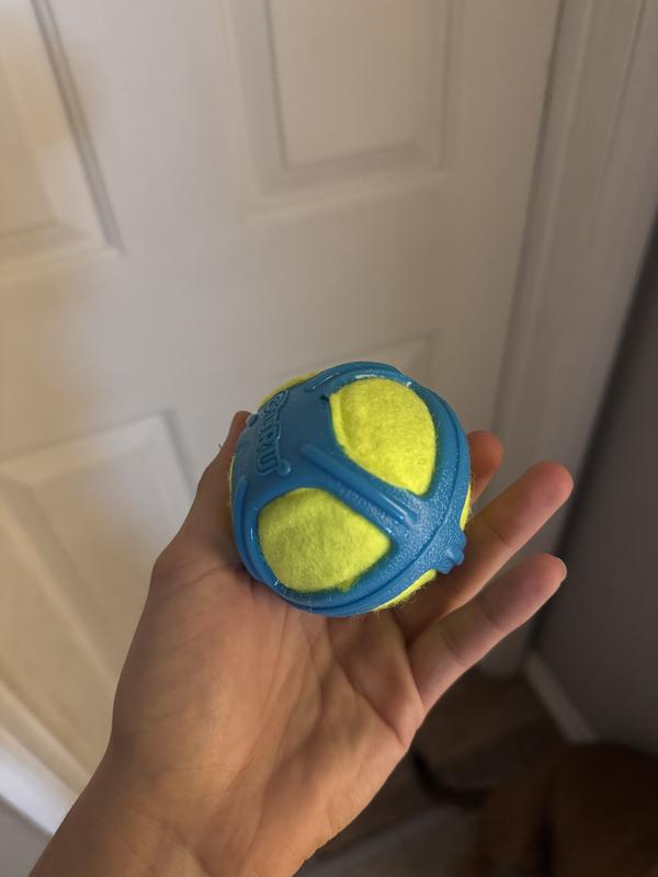 My dogs love this ball- the grips over the tennis ball are perfect for their frenchie mouths and it’s nice they can sit and chew when they retrieve it and I don’t