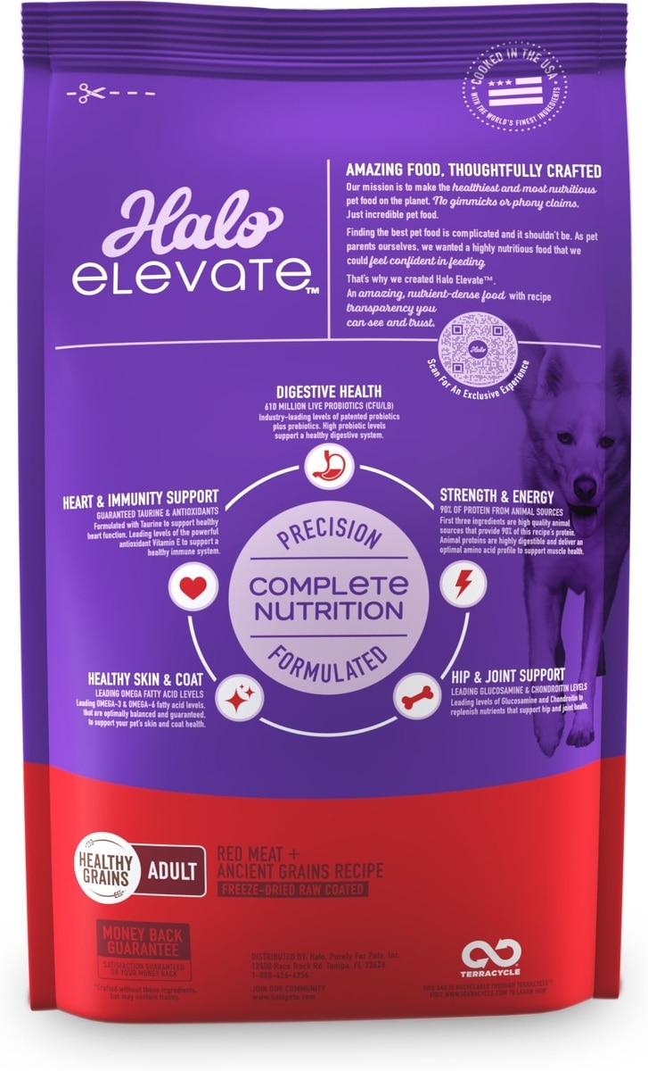 Halo Elevate was developed by veterinary and nutrition experts to support the top five health needs: digestive health, heart & immunity support, strength & energy, healthy skin & coat, and hip & joint support. Their recipes don't have anything to hide — just check the bag to see all their wholesome ingredients.
