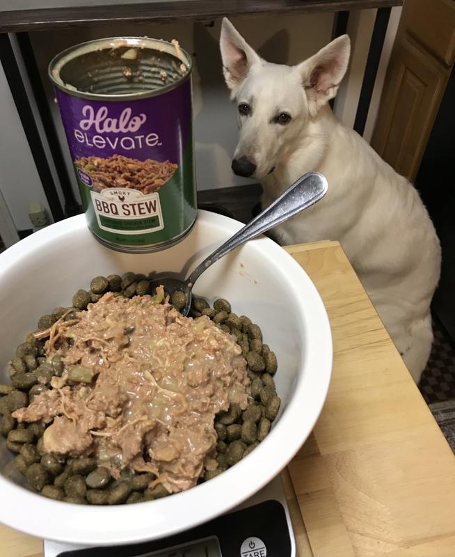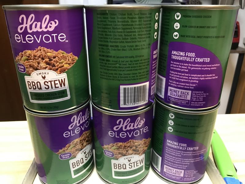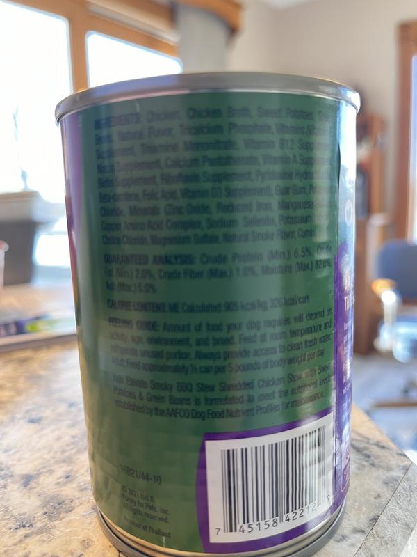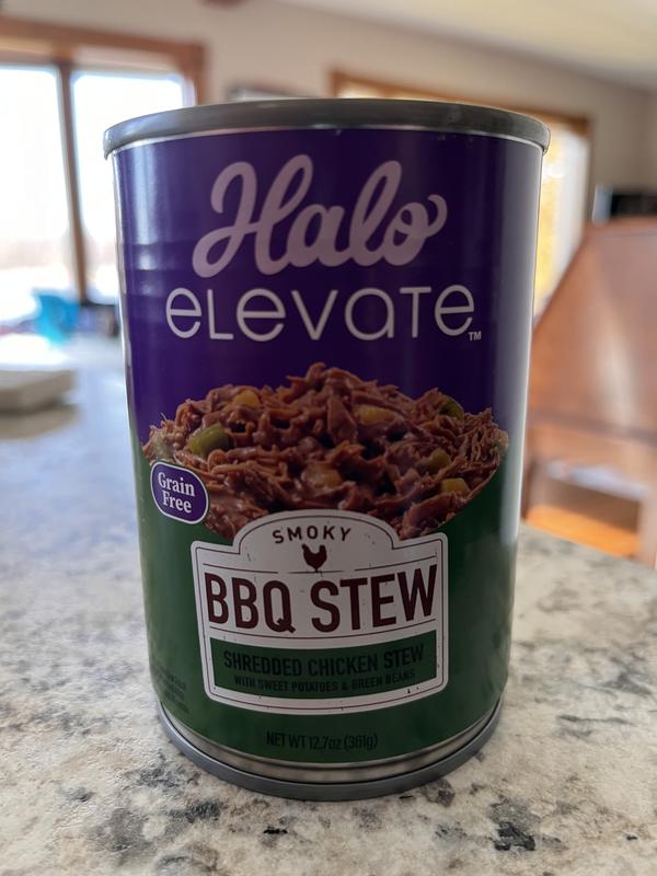 - Halo Elevate Smoky BBQ Glazed Chicken Stew with White Potatoes & Carrots Grain-Free Wet Dog Food, 12.7-oz can, case of 6$26.94 Chewy Price$25.59 Autoship PricePromo, New Customers Only: Spend $49+, Get $20 eGift Card +1 deal