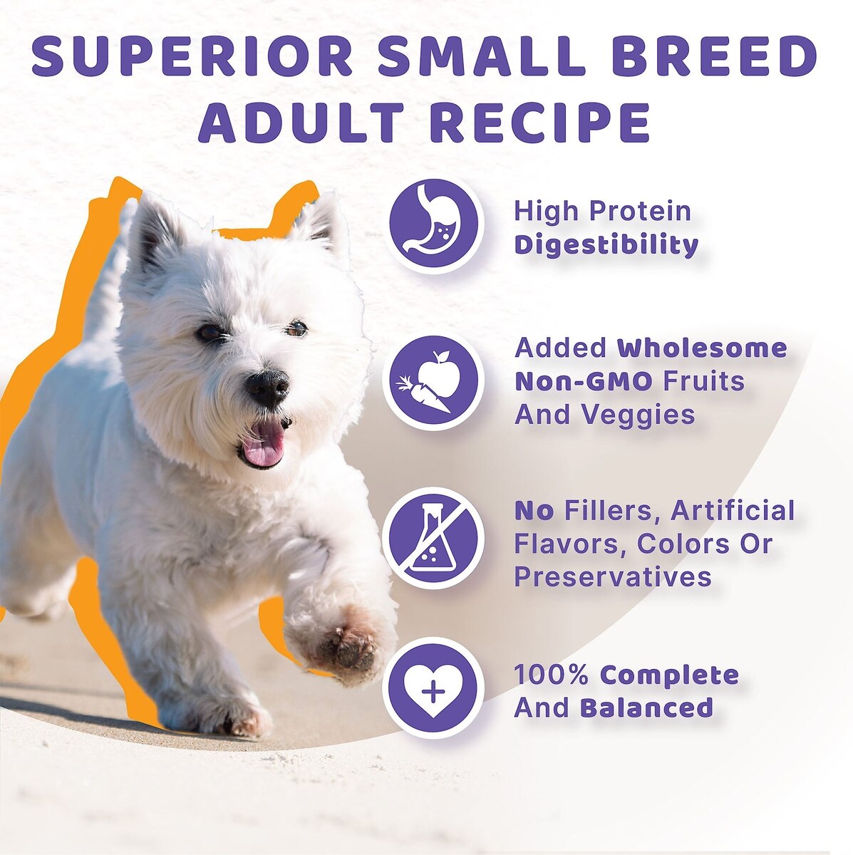 • Smaller kibble formula features higher protein for small breeds, and omega fatty acids support skin and coat health.