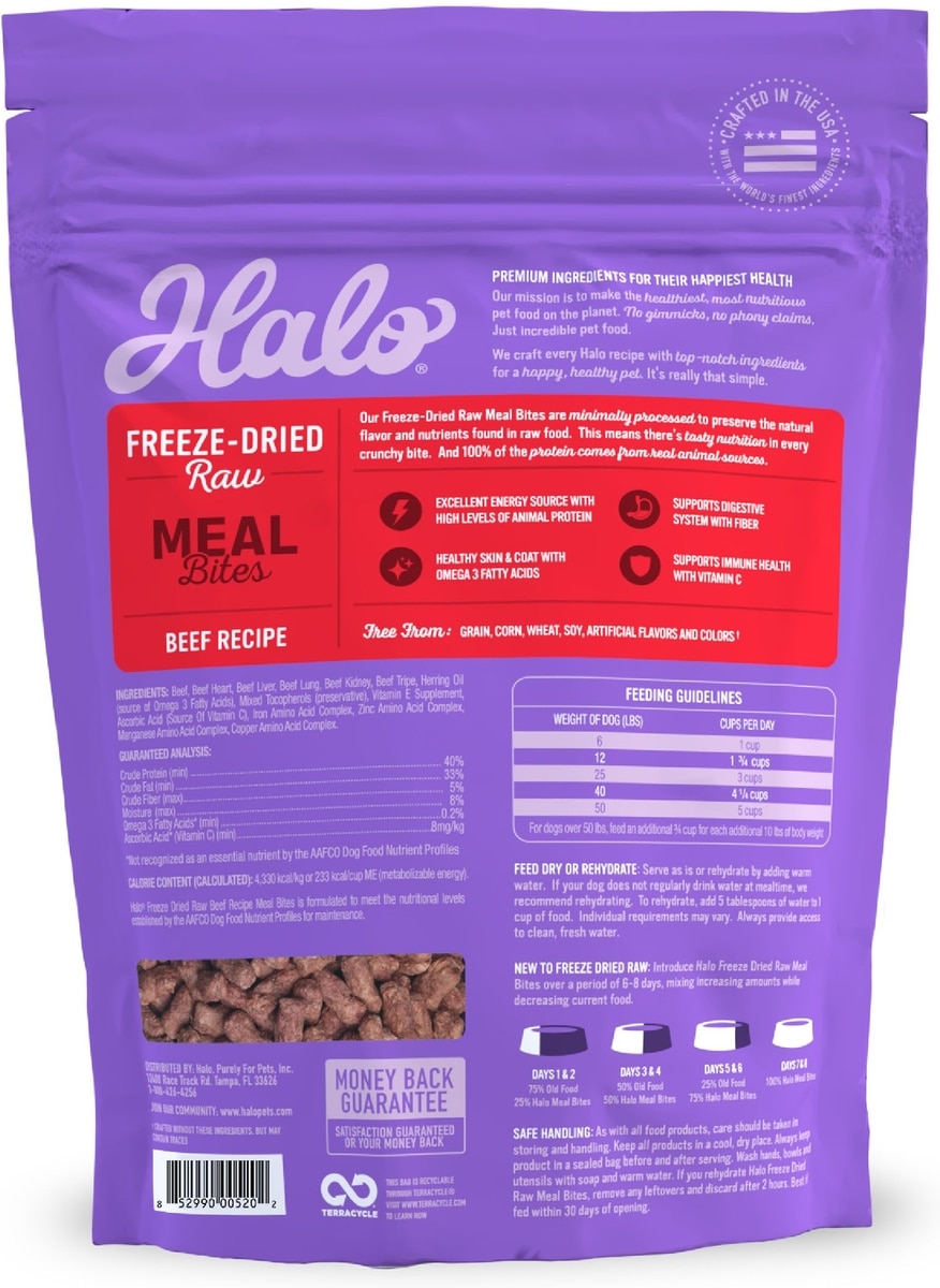 Halo Meal Bites Beef Recipe Raw Freeze-Dried Dog Food, 14-oz bag — TruDog is now Halo! with the same great taste and nutrition your furry friend loves! A delicious meal that’s also packed with nutrients? It’s not im-pawsible—thanks to Halo Meal Bites Freeze-Dried Raw Dog Food, Beef Recipe! Made with all-natural beef and organs, this mouthwatering food has been freeze-dried to capture the natural flavors and nutrients of raw food. You won’t find any grain, corn, wheat, soy, fillers or artificial flavors and colors—the only ingredient is beef. This means your canine companion can get a boost of protein, Vitamin C, fiber and Omega-3 from this delectable dish. Add the ulti-mutt crunch to your pooch’s kibble, or serve it as its own meal!