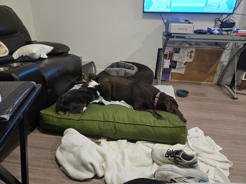 This bed is perfect for our large and medium dog to share. They like to hang out together, and it's ideal. We love the color--navy--and it's the perfect size and shape.