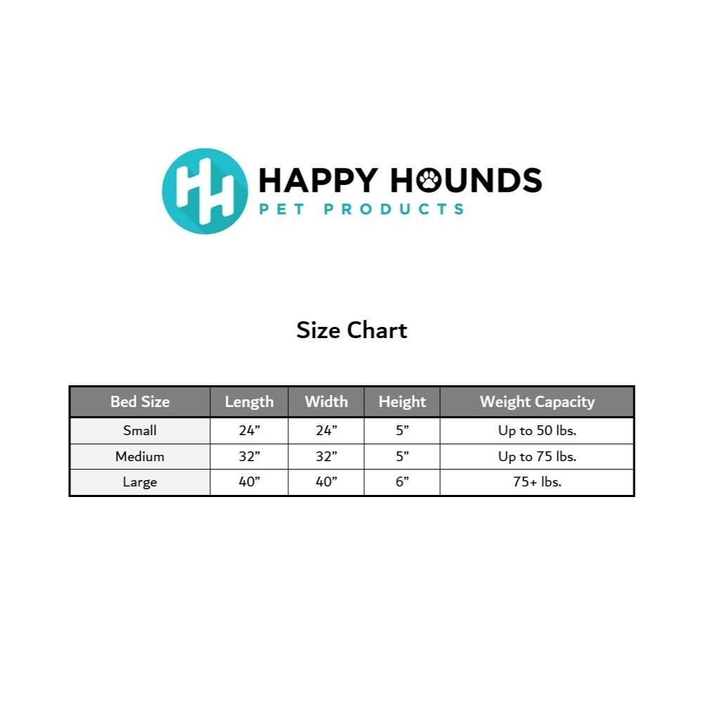 The small is 24 inches long, 24 inches wide, and 5 inches tall. The medium is 32 inches long, 32 inches wide, and 5 inches tall. The large is 40 inches long, 40 inches wide, and 6 inches tall.