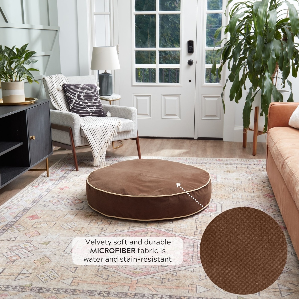 - This bed features durable microfiber fabric that is resistant to water and stains.