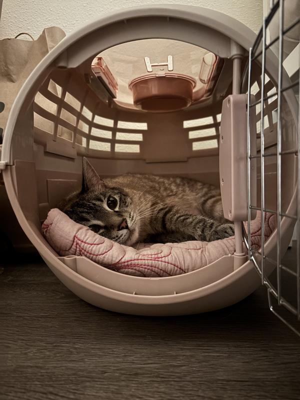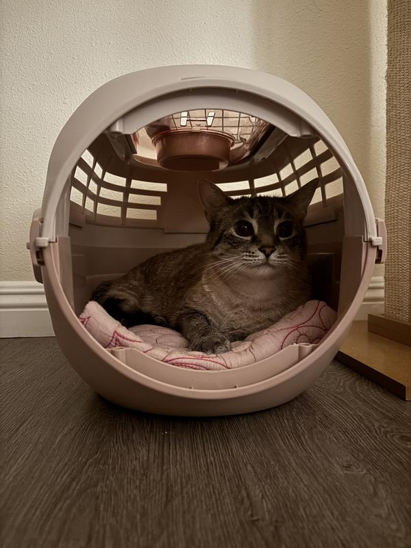 I get pink everything for my fabulous feline friend, Pinky. It was delivered unassembled but was fairly easy to put together; though I was left with an extra clip I’m not sure is a spare or actually goes to something because I didn’t actually read the assembly instructions. The carrier isn’t particularly spacious, and it didn’t come with a comfortable insert. It came with the weird mat that seemed like it might make my cat nervous. I put a jacket in for some padding, and then there was REALLY no room. It does seem to be sturdy and breathable though, so that’s nice. The picture and my own phone camera don’ t do it justice, but it’s much more pigmented than it looks.