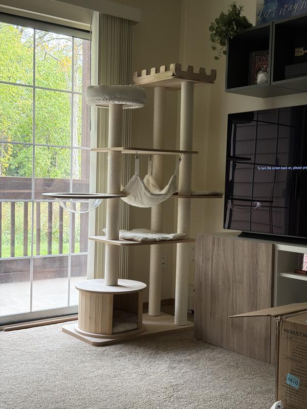 This cat tree is large in size, with multiple platforms, a hidden nook, and resting areas. Ideal for multi-cat homes, it allows cats to climb, play, or lounge without crowding.