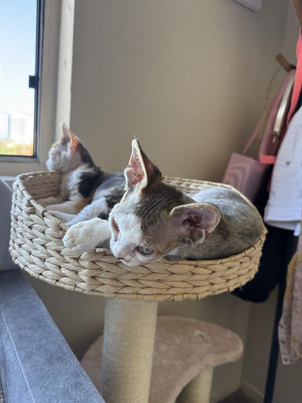 Sasha likes curling up in the larger basket. However neither cat seems interested in the small higher basket perch.